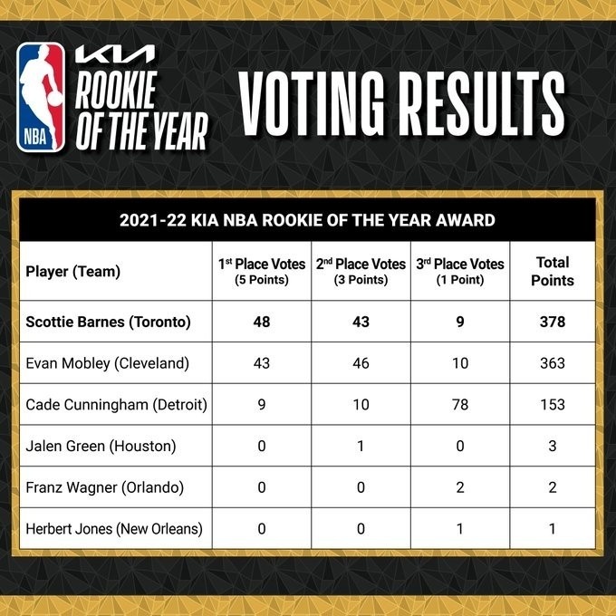4月24日讯 今天,NBA官方公布了本赛季最佳新秀的投票结果,猛龙队的4号秀斯科蒂-巴恩斯以微弱的优势战胜骑士探花莫布里。
