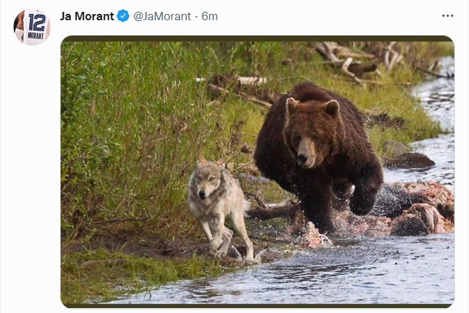 直播吧4月30日讯今日NBA季后赛,灰熊客场114-106战胜森林狼,大比分4-2淘汰对手,晋级次轮。赛后莫兰特在社交媒体晒图,图中是一头熊追逐一只狼的画面,以庆祝灰熊淘汰森林狼。本场比赛莫兰特出战3