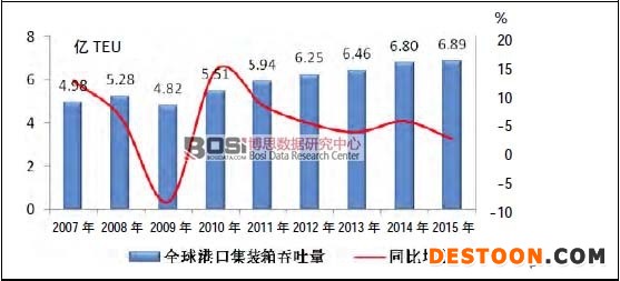 2015 年,全球港口集装箱吞吐量同比增长1.3% 至6.89 亿TEU,增速较上年下降4 个百分点,除2009 年(增速为-8.7%)以外,2015年增速为1980 年以来的最低水平。
