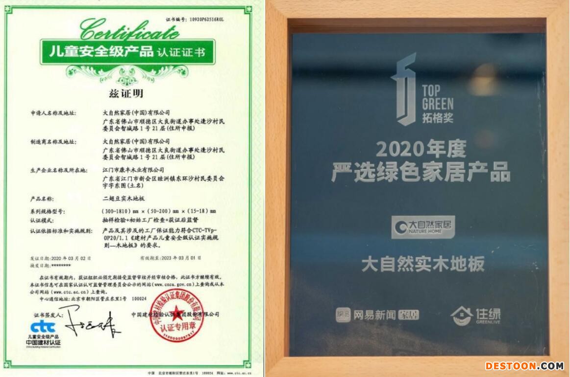 由此可见,只有品质过硬的产品和服务,才能在全国市场布局中抢占市场份额,最终赢得消费者信任。凭借良好的产品口碑和出色的市场表现,近年来大自然实木地板先后获得“红棉中国设计奖·产品设计至尊奖“、“儿童安全级产品认证”“2020年度严选绿色家居产品”等多项荣誉,受到了行业及媒体的广泛认可。
