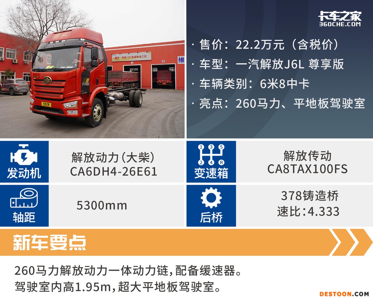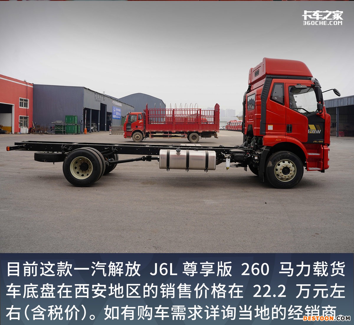 目前这款一汽解放J6L 尊享版260马力载货车底盘在西安地区的销售价格在22.2万元左右(含税价)。地区不同经销商的报价、金融政策均有不同,如有购车需求请您详询您当地的经销商。