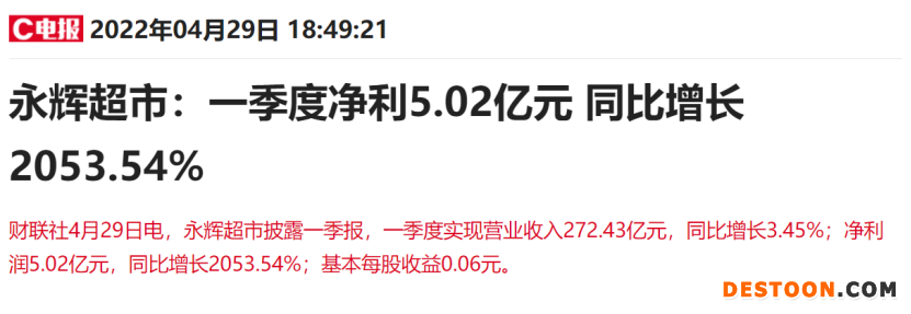 永辉超市昨晚发布了2021年报和2022年一季报。一季度归母净利润5.02亿元,同比增长2053.54%。不过,2021年归母净利润亏损39.44亿元。