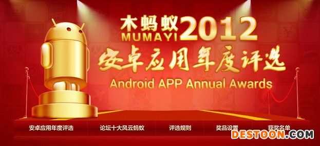 由国内最大Android应用市场之一的木蚂蚁应用市场主办的“2012安卓软件年度评选”活动在历经了一个月数百万网友的热情投票评选后,于近日圆满结束。自从2012年12月1日活动上线以来,活动就受到了业界以及广大安卓用户的强烈关注。本次评选本着让用户自主选出“用户最喜爱的安卓应用”的原则,国内外超过8万款应用、游戏都参与了评选活动。最终经过广大热心网友的投票,评选出了16款用户最喜爱的安卓应用。