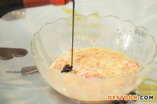 2、肉馅加入鸡蛋和清水顺时针搅匀,再加入老抽、料酒和盐拌匀。