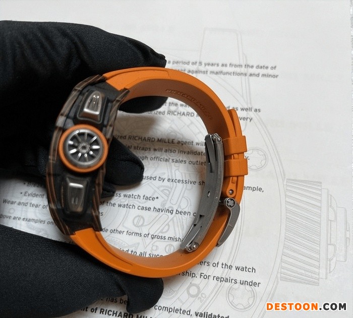 接下里的重点会放在我擅长的手表介绍上,这篇文章不添加任何个人评价色彩,只是简单客观的介绍。依旧保留着无比舒适的弧形设计,但是理查德米勒在这款手表上还是花了不少心思,其中包括与迈凯伦720S和钛镶嵌件的独特前灯设计相呼应的钛制计时按钮让人联想到迈凯轮F1的进气通气管,还有表冠,形状像一个迈凯轮轻量级车轮和橙色橡胶轮胎。不用说,这款手表会给手腕留下非常深刻的印象——49,94毫米x44,50毫米x16毫米x16毫米表壳以及明亮的橙色点缀。