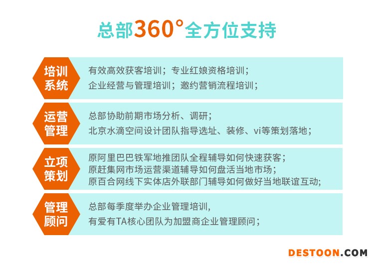 对于店铺的运营过程,也会贡献出品牌总部的力量,多年经营摸爬滚打出的运营经验可以为店铺解决运营障碍,还能为加盟商提供更加适合店铺的策划活动方案。有爱有Ta品牌创始人早在多年前就帮助过一线婚介品牌运作过线下实体门店,当之无愧成为下沉市场婚介品牌。