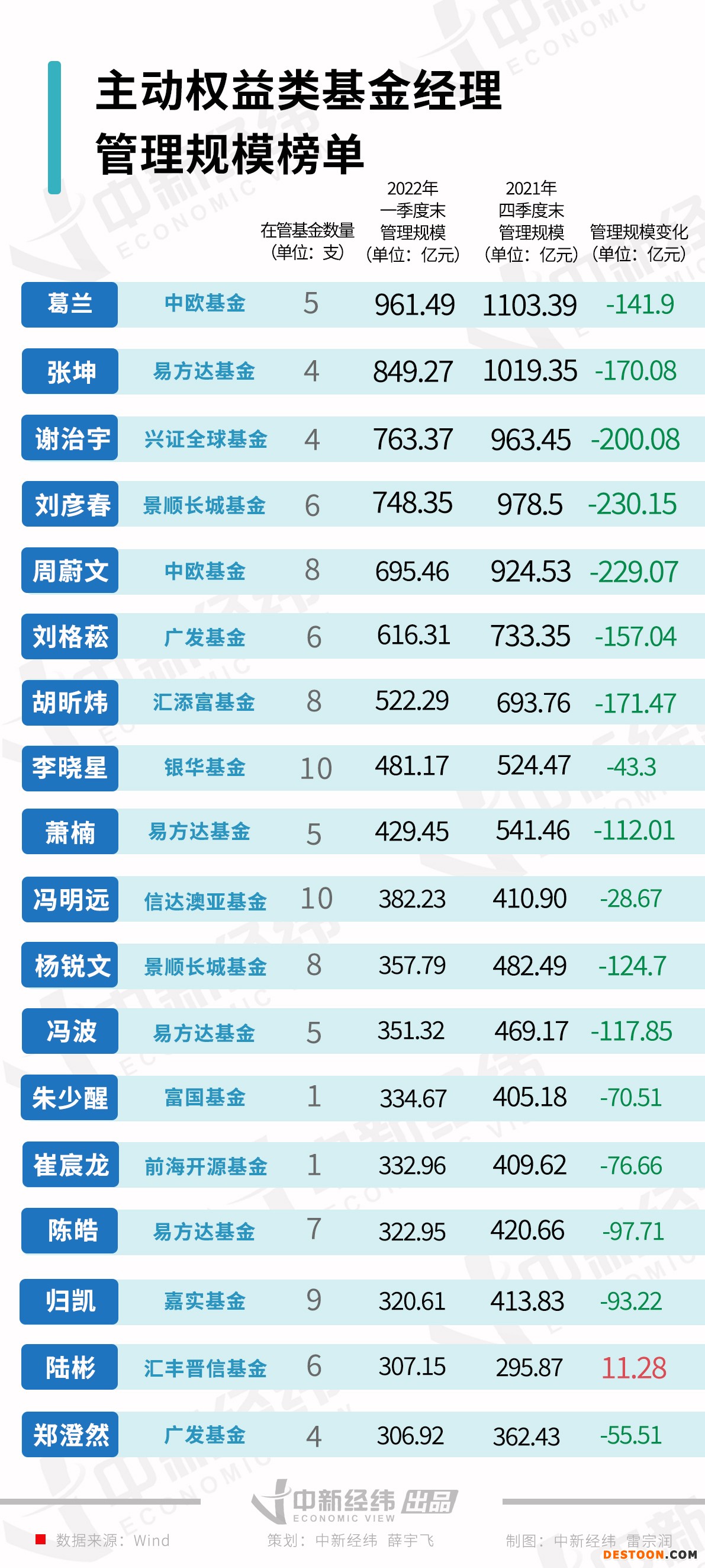 除此以外,截至2022年一季度末,谢治宇的管理规模降至763.37亿元,较上季度末下降200.08亿元;中欧基金周蔚文的管理规模降至695.46亿元,较上季度末下降229.07亿元;刘格菘的管理规模降至616.31亿元,较上季度末下降157.04亿元;汇添富胡昕炜的管理规模降至522.29亿元,较上季度末下降171.47亿元。