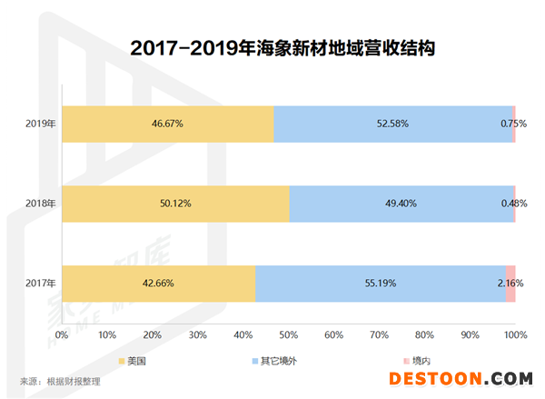 从海象新材的招股书来看,2017年度、2018年度和2019年度,公司境外主营业务收入占公司主营业务收入的比例为97.84%、99.52%和99.25%。