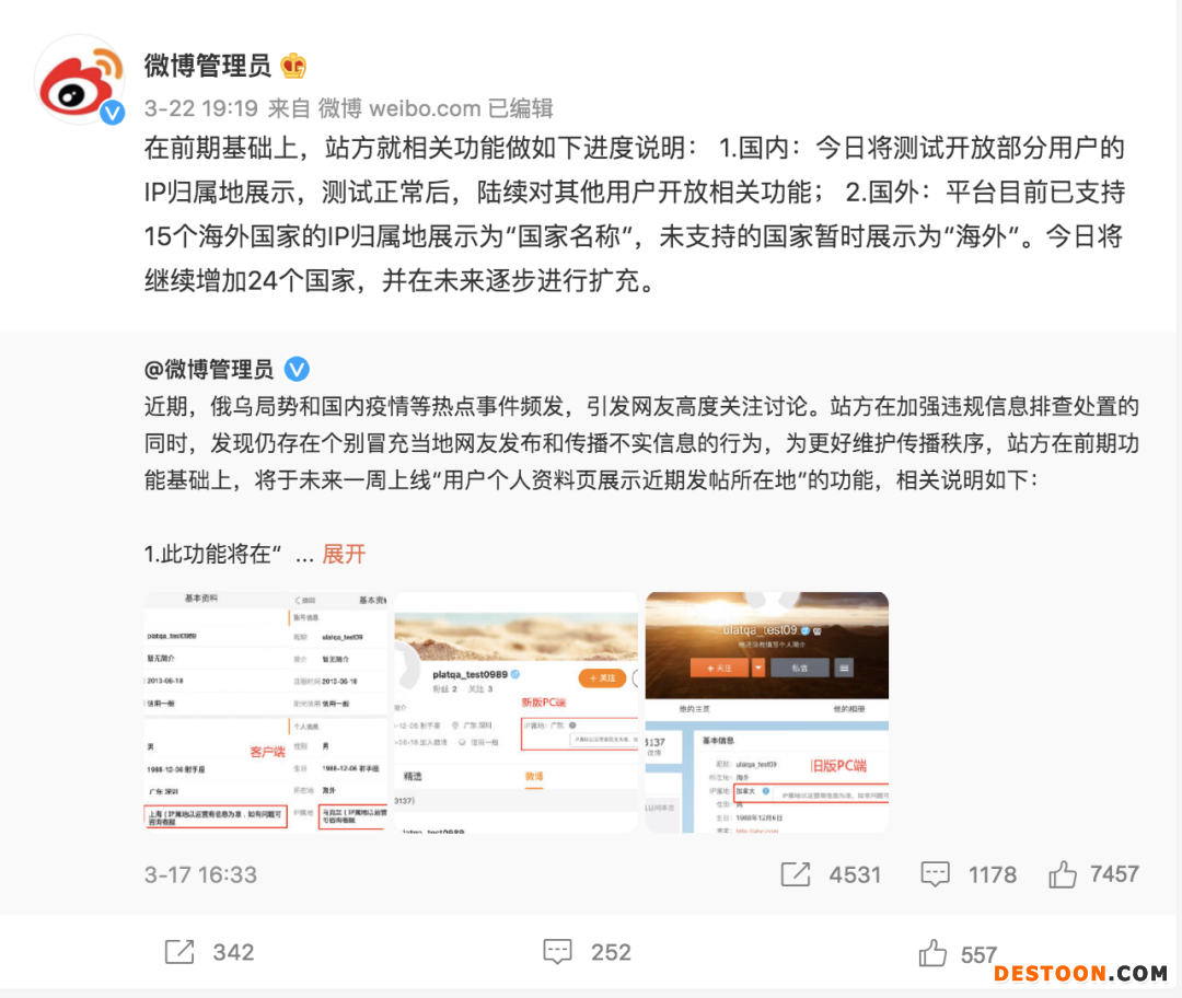 根据@微博管理员 发布的社区公告,由于俄乌局势和国内疫情等热点事件频发,引发网友高度关注讨论。站方在加强违规信息排查处置的同时,发现仍存在个别冒充当地网友发布和传播不实信息的行为,为更好维护传播秩序,站方在前期功能基础上,决定上线“用户个人资料页展示近期发帖所在地”的功能,展示用户最近一个月内最后一次发布博文或评论的IP归属地。
