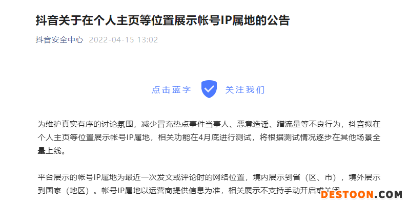抖音安全中心发布的公告也显示,相关功能在4月底进行测试,将根据测试情况逐步在其他场景全量上线。平台展示的账号IP属地为最近一次发文或评论时的网络位置,境内展示到省(区、市),境外展示到国家(地区)。账号IP属地以运营商提供信息为准,相关展示不支持手动开启或关闭。