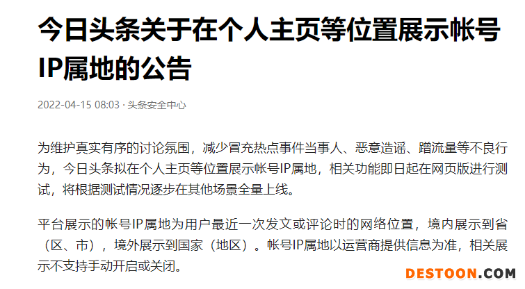 4月15日,今日头条和抖音相继发布公告称,为维护真实有序的讨论氛围,减少冒充热点事件当事人、恶意造谣、蹭流量等不良行为,拟在个人主页等位置展示账号IP属地。