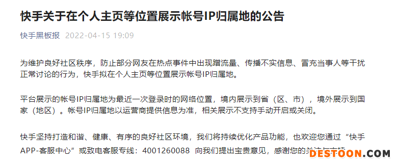 4月15日,快手也发布公告称,为维护良好社区秩序,防止部分网友在热点事件中出现蹭流量、传播不实信息、冒充当事人等干扰正常讨论的行为,快手拟在个人主页等位置展示账号IP归属地。平台展示的账号IP归属地为最近一次登录时的网络位置,境内展示到省(区、市),境外展示到国家(地区)。账号IP归属地以运营商提供信息为准,相关展示不支持手动开启或关闭。
