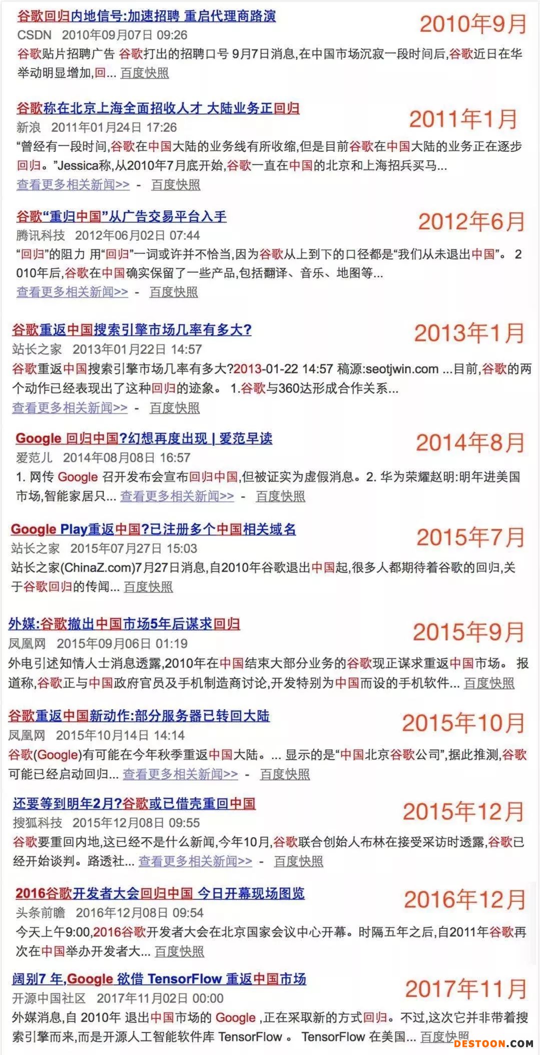 另一方面,这8年间,谷歌的管理也发生巨大变化。该公司联合创始人越发很少的参与公司运营,而谷歌现任CEO Pichai 则一直暗示想带领谷歌重回中国市场的愿景。