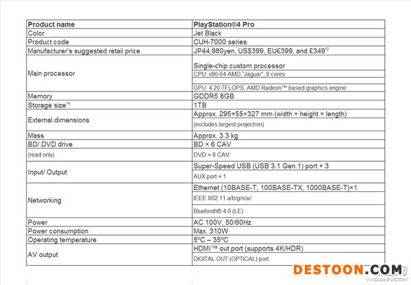 新版PS4将于9月15日上市发售,售价299美元,PS4 Pro将于11月10日上市发售,售价399美元。这两个版本都是可以运行PSVR虚拟现实系统,但是Pro具有更好的虚拟现实体验。支持4K游戏内容和HDR模式。下面是PS4 Pro的配置: