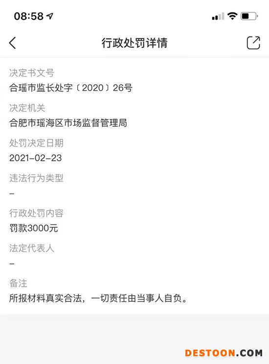 记者注意到,去年2月份,安徽嗨澳菲进出口贸易有限公司曾因发布虚假广告,违反《广告法》被罚款3000元。