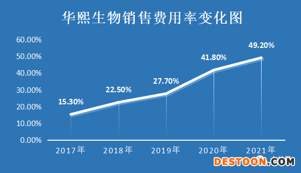 尽管功能性护肤品业务带动华熙生物营收迅速上涨,但净利被拉下8.8个百分点至15.7%。这里面,包括了销售费用逐渐高企。这是因为,护肤品业务其实是TO C的模式,一是客单价低,二是市场推广费用高。从财报中可以看到,华熙生物2021年的销售费用比2020年翻倍,由10.99亿元上升到了24.36亿元。更关键的是,销售费用率2021年达到了49.2%。也就是说华熙生物花了近一半收入用于推广获客。