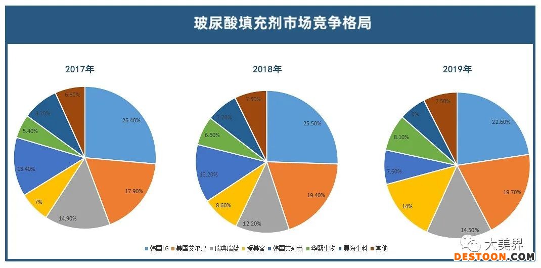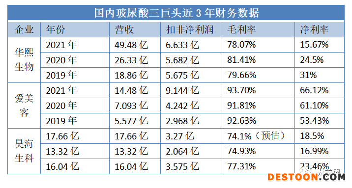 最先受益的,便是在上世纪末和本世纪初就布局的企业们:爱美客在2009年国内首款透明质酸类填充产品EME逸美获批上市;华熙生物在2012年推出了润百颜注射用修饰透明质酸钠凝胶,其是国内首家获得批准文号的国产交联透明质酸软组织填充剂;昊海生科在2013年推出了海薇注射用交联透明质酸钠凝胶。由于整个市场供小于求,且竞争门槛较高,玻尿酸产品不愁卖,率先布局的三巨头很快就站稳了脚跟。