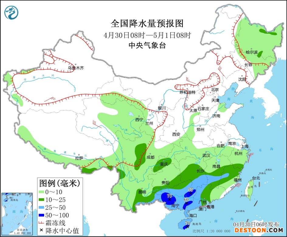 4月30日08时至5月1日08时,青海东部、甘肃西南部、川西高原北部等地的部分地区有小到中雪或雨夹雪,局地有大雪;江南中南部、重庆南部、贵州南部、云南东南部、华南大部等地的部分地区有中到大雨,其中广西东部和西部、海南岛等地部分地区暴雨(50~70毫米)。内蒙古、华北北部、东北地区等地的部分地区有4~6级风(见图1);台湾海峡有5~7级、阵风8级的东北风。