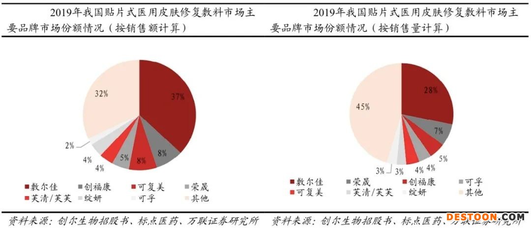 目前国内的医用敷料市场是二八法则,几家头部企业占据了大部分市场,其产品合规程度更高,几乎未被新《一类目录》所波及。全拓数据显示,在我国贴片式医用皮肤修复敷料市场,最受消费者青睐的五大医美面膜品牌市占率达62%,排名第一的敷尔佳在2019年的销售份额为37%,创福康市场份额为32%。