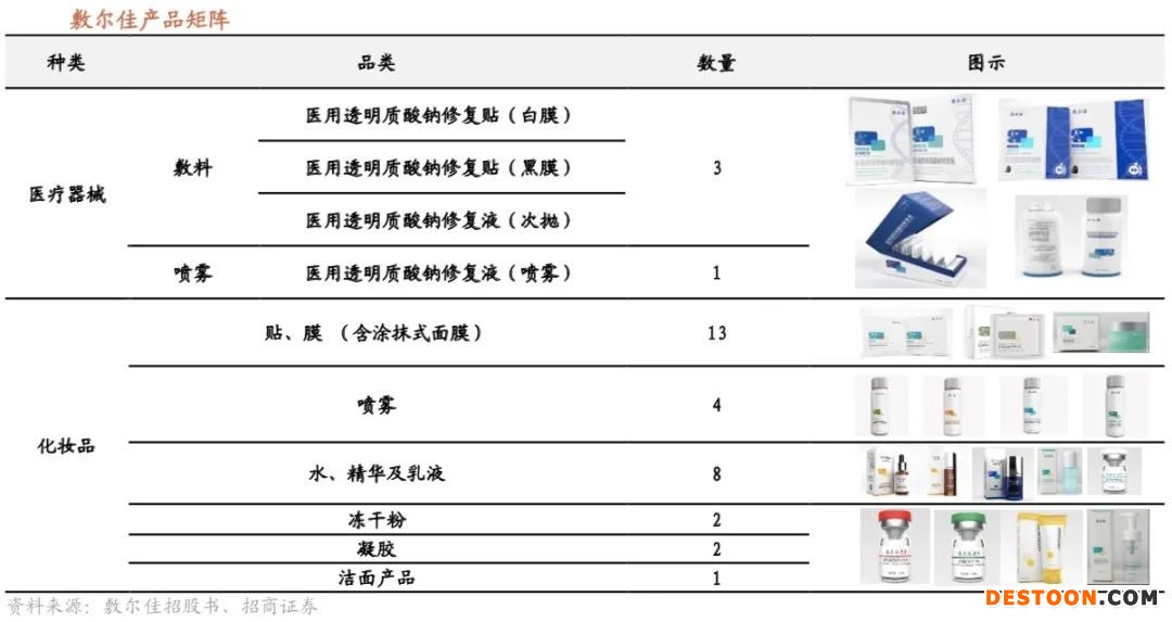 以敷尔佳为例,其产品矩阵包括医疗器械和化妆品两大类,医疗器械分类中有3款医用敷料产品,即医用透明质酸钠修复贴(白膜、黑膜)、医用透明质酸钠修复液(次抛),以及1款喷雾产品,医用透明质酸钠修复液。敷尔佳的白膜、黑膜均已获批国家二类医疗器械批文。