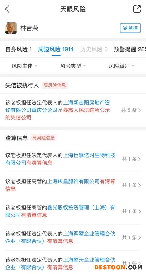 值得关注的是,自2017年以来,上海达尔威涉及多起诉讼,案由包括服务合同、买卖合同等。未来网记者梳理后发现,目前张庭名下拥有实际控制权的公司有16家,其中2家已注销。与此同时,林瑞阳名下多家公司还被列入失信名单、欠税名单,其担任法定代表人、高管的10家企业也已清算。