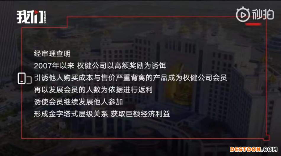 2019年12月,天津市武清区人民检察院指控权健自然医学科技发展有限公司:该公司以高额奖励为诱饵,引诱他人高价购买产品,以发展会员的人数作为返利依据,诱使会员继续发展他人参加,收取传销资金,情节严重。而后,权健集团董事长束昱辉等12名被告人被依法追究刑事责任。