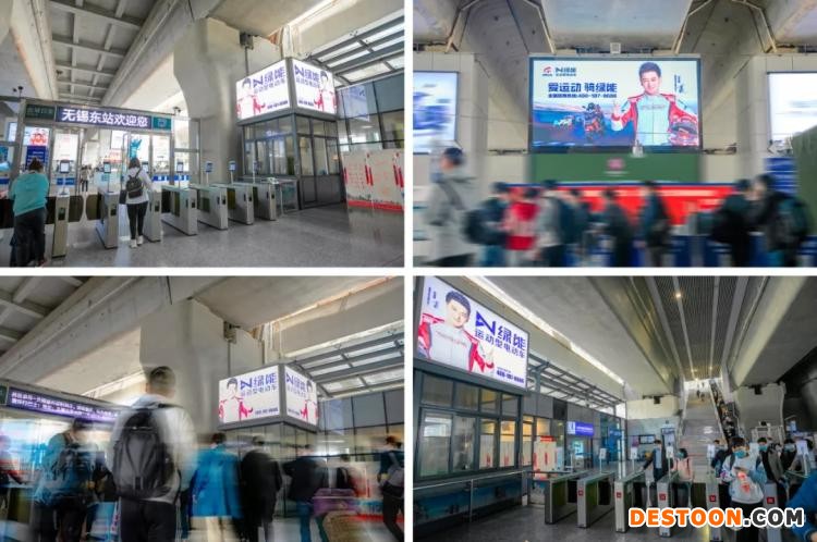 同年4月,绿能又完成一大产业城市——无锡的高铁站广告覆盖。无锡作为中国电动车行业最大的生产基地,抢占高铁站黄金资源位置代表着品牌的实力。绿能这次在无锡东站以巨幅LED和灯箱的广告形式展出,在高铁交通中枢的黄金区域,展现绿能独一无二的运动型品牌画面风格。