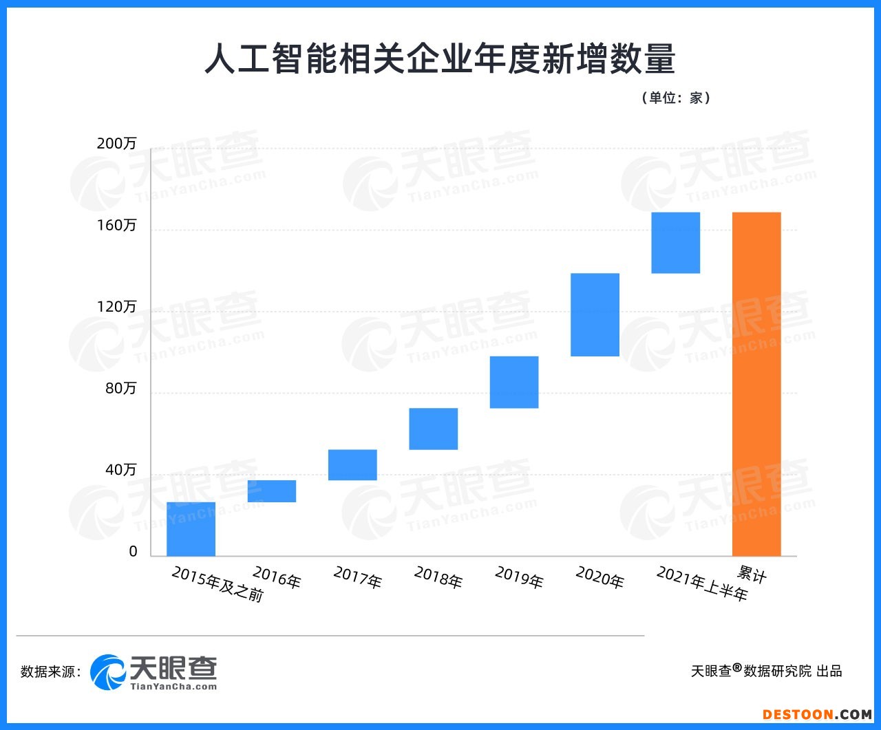 人工智能技术是我国新基建信息基础设施当中的新技术基础设施之一,其作用是在实体经济中找到应用场景,赋能生产力升级,推动各行业完成智能化转型和新旧动能转换。与此同时,人工智能领域企业也迎来发展的黄金期。根据天眼查的数据显示,2021年上半年人工智能相关企业新增注册量已经达到30万余家,同比增长88%。