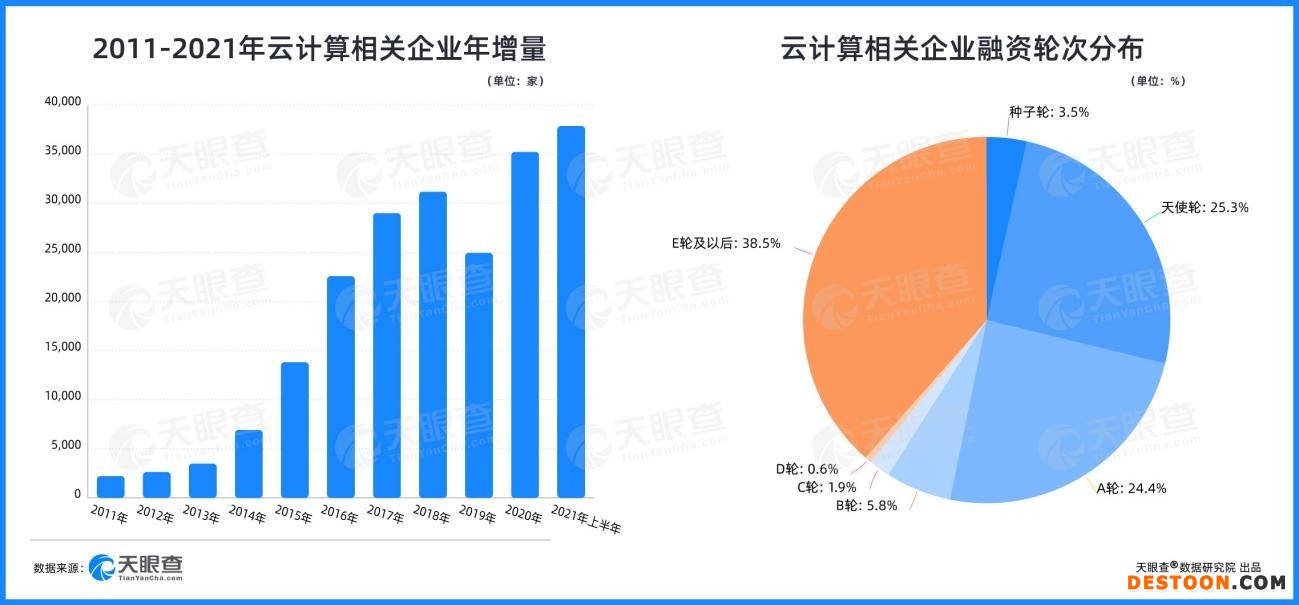 从融资方面来看,云计算的相关企业融资大多分布在A轮,通过天眼查数据研究院的相关数据研究可以发现,随着云计算相关企业发展的不断成熟,云计算投资偏好呈现后移趋势。而从行业分布来看,约9成获得融资的云计算相关企业分布在企业服务行业。通过分析投资行为,天眼查数据研究院认为,随着应用开展和市场需求,SaaS成为云计算领域投资的热点。