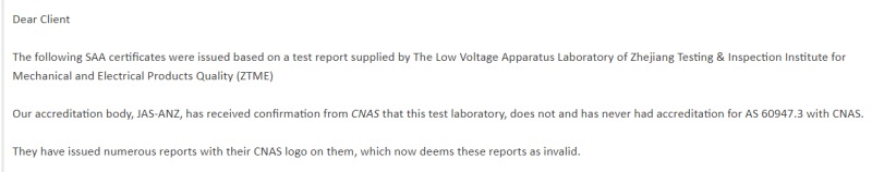 10月1日,澳洲SAA Approvals Pty Ltd发布重磅消息,正式通知所有通过ZTME实验室获得的AS60947.3报告无效,这也意味着几乎所有SAA颁发的隔离开关证书失效。而从2022年1月1日开始,澳洲市场销售的外置隔离开关必须要有新认证,而目前仅有通过TÜV莱茵澳大利亚本土获得AS60947.3报告的隔离开关才符合澳洲市场要求!