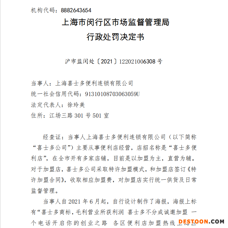 决定书显示,经查证:当事人上海喜士多便利连锁有限公司(以下简称“喜士多公司”)主要从事便利店经营,店招名称是“喜士多便利店”,在全市开有多家店铺,目前是以加盟为主,直营为辅。对于加盟店,喜士多公司采取特许加盟模式,和加盟店签订《特许加盟合同》,收取相应加盟费,对加盟店实行统一供货及日常监督管理。