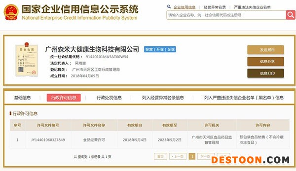 记者通过国家企业信用信息公示系统查询发现,广州森米大健康生物科技有限公司的经营范围包括机器人的技术研究、技术开发;商品批发贸易(许可审批类商品除外);日用杂品综合零售;百货零售(食品零售除外)等,但没有显示与食品有关的经营项目。然而,其行政许可信息却显示,森米有食品经营许可证,许可内容为预包装食品销售(不含冷餐冷冻食品),许可机关是广州市天河区食品药品监督管理局。