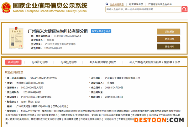 此外,“广州森米生物科技有限公司”还因“登记的住所或经营场所无法联系”,而两度被广州工商局天河分局列入“经营异常”名单,最近的一次为2019年1月。