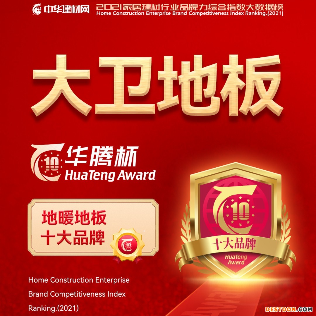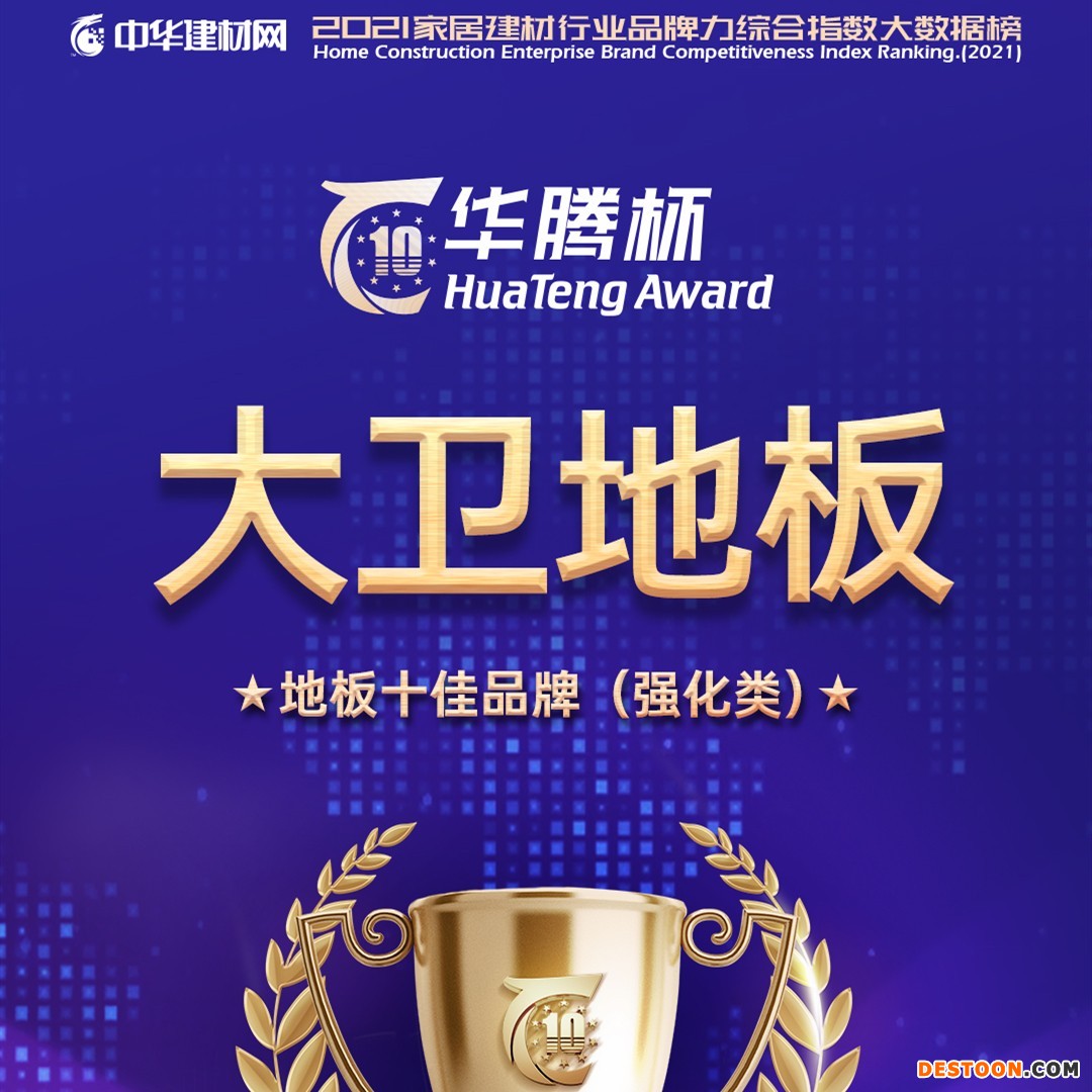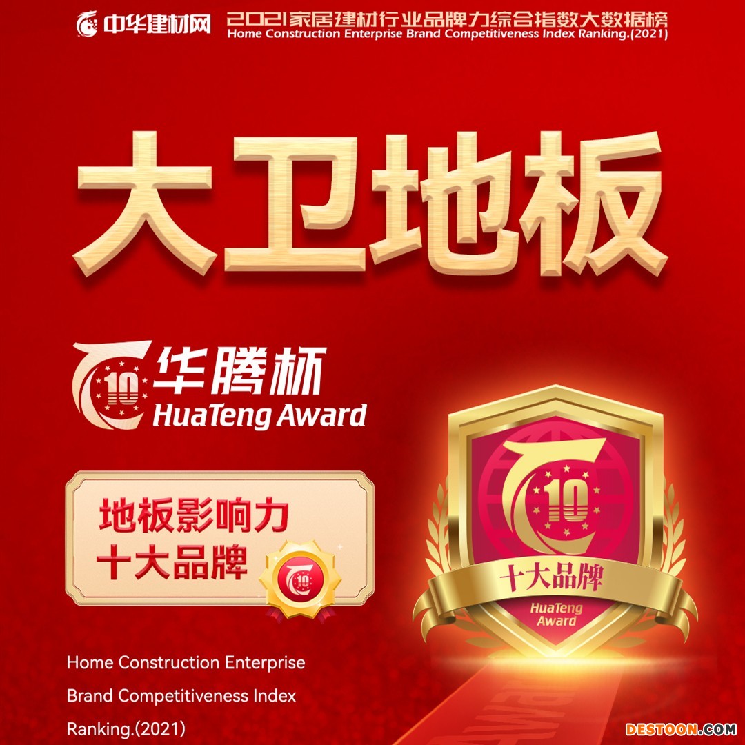 居人携手并进,砥砺前行,有这样一批优质企业依托自身核心竞争力从数以千计的同类型企业中脱颖而出,荣登“华腾杯”2021地板十大品牌榜单!大卫地板连获“地板影响力十大品牌”、“地暖地板十大品牌”、“强化地板十佳品牌”,这也是自2012年以来,大卫地板第10次获此殊荣。创变年,赢战2021,大卫23岁,是