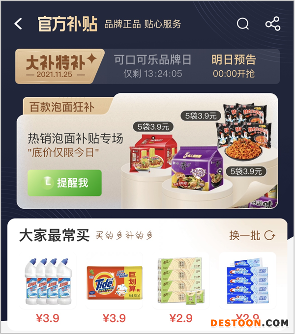 淘特官方补贴业务负责人介绍,淘特“官方补贴”聚焦超市热销品,前期主要联动民生大品、米面粮油及生活刚需高复购品类品牌丰富保障,后期还将针对垂直人群和消费场景做品类细化和拓展。
