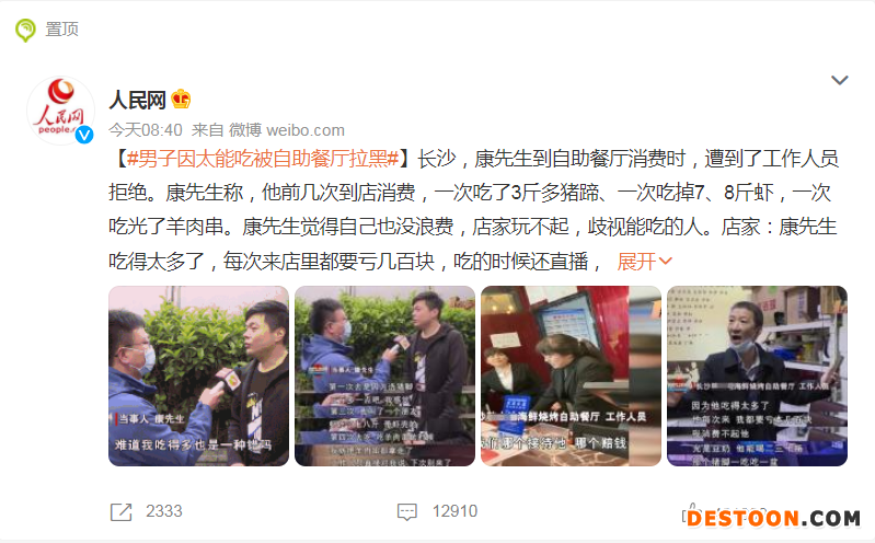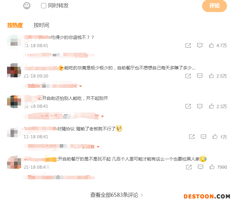 对此,微博网友吵翻了,纷纷发表自己的看法。有网友表示,“吃得少的你退钱不?”,“开自助还怕别人能吃,”,也有网友表示,“能吃的毕竟是极少极少的,自助餐厅也不想想自己每天多赚了多少。”