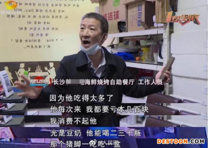据长沙政法频道报道,康先生告诉记者,自己是一名美食主播,近一周来,他连续4次来到该店铺就餐,“有一次我大概吃了5盘猪蹄,喝了十几瓶豆奶,还吃了生蚝,吃了几盘虾,一些水果,也没有太多,大概五六斤的样子。”