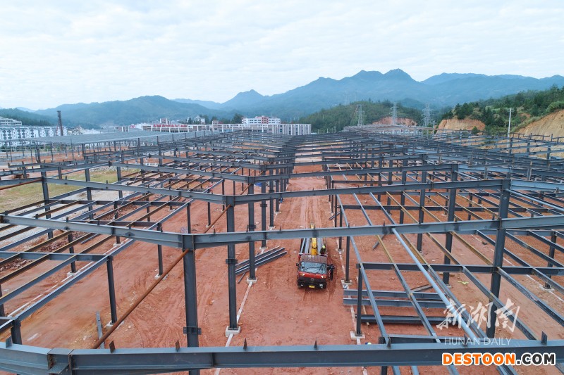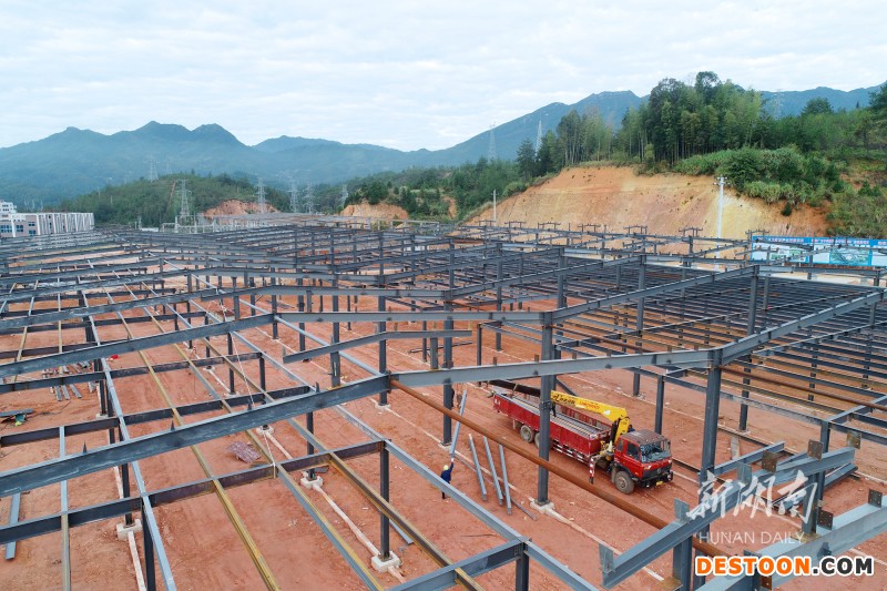 10月26日,桂东县大塘镇,湖南广玉中药材开发有限公司标准厂房建设工地,建筑工人抢抓晴好天气,利用吊车等大型机械建设厂房,建设工地一派如火如荼景象。该项目位于总投资10亿元,占地107亩,建设标准厂房85000平方米,2021年初开工,计划2022年初步建成,项目投产后,可安置当地劳动力1000余人。邓仁湘 摄