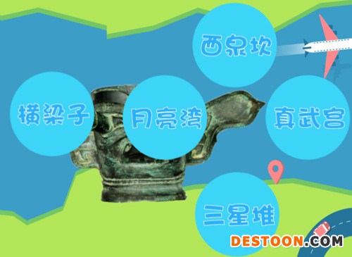 三星堆遗址比较重要的有南部的三星堆,中部的月亮湾、真武宫,北部的西泉坎,东部的狮子堰,西部的横梁子以及向西延续的仁胜村、大堰村等,出土了大量的陶、石、玉、铜、金器,地方文化鲜明。