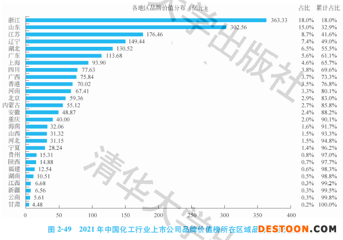 在2021中国化工行业上市公司品牌价值榜中,排在前10位的公司品牌价值合计722.03亿元,占行业榜单总计品牌价值的35.7%。