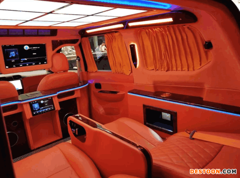 虽然这次改造的主要部分是后排,但是前排座位也被升级了一下,总体的格调都被提高了不知道多少个层次,他选择了橙色的主题,让人看起来就像是火焰一样,极其美妙。而且得益于后排的空间大,所以后排能够被改造成头等舱一样的车厢,给人的感觉就像是vip包厢。