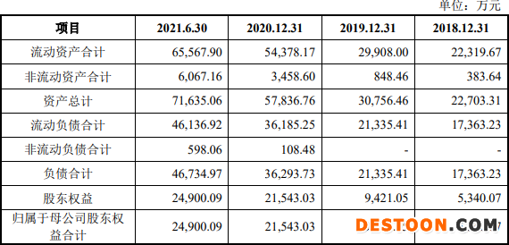 2018年至2021年1-6月,楚环科技资产总计分别为22,703.31万元、30,756.46万元、57,836.76万元、71,635.06万元,其中,流动资产分别为22,319.67万元、29,908.00万元、54,378.17万元、65,567.90万元。