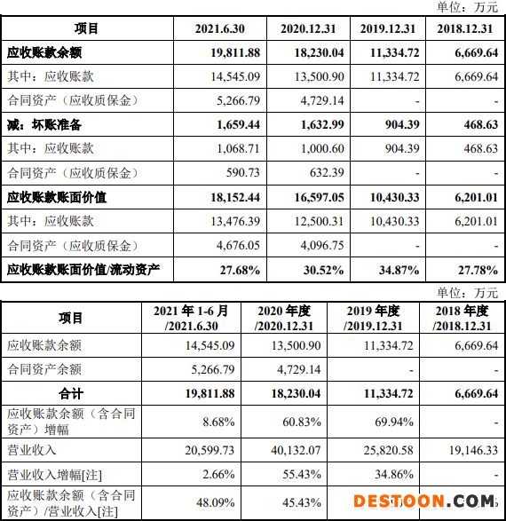 2018年至2021年1-6月,楚环科技应收账款账面价值分别为6,201.01万元、10,430.33万元、12,500.31万元、13,476.39万元,占流动资产比例分别为27.78%、34.87%、22.99%、20.55%;应收账款余额分别为6,669.64万元、11,334.72万元、13,500.90万元、14,545.09万元,2020年、2021年1-6月合同资产(应收质保金)分别为4,729.14万、5,266.79万元,合计占营业收入比例分别为34.84%、43.90%、45.43%、48.09%。