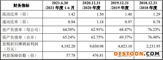 2018年至2021年1-6月,楚环科技流动比率分别为1.29倍、1.40倍、1.50倍、1.42倍,速动比率分别为0.78倍、0.97倍、1.18倍、0.94倍。