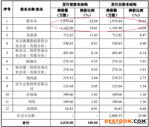 招股书显示,楚天科技本次发行前总股本为6,028.00万股,发行后总股本8,037.35万股。本次发行前,第一大股东陈步东持股比例为32.84%,本次发行后持股比例为24.63;本次发行前,第二大股东徐时永持股比例为19.01%,本次发行后持股比例为14.26%。