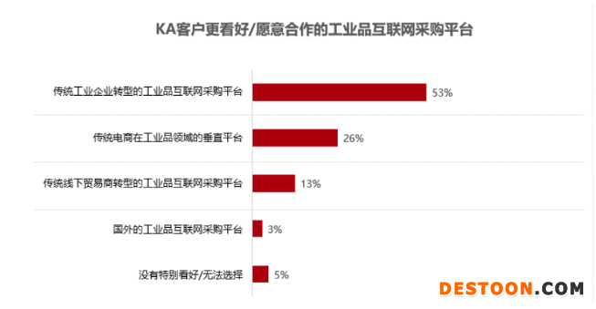 据相关机构统计显示,企业主、采购人员方对于工业品采购平台态度中,53%KA客户更偏好传统工业企业背景的工业品采购平台,认可这类平台更了解工业制造业的需求、供应商资源丰富、质控严格;其次,26%青睐传统电商背景在工业品领域的垂直平台,成熟的互联网技术和网络流量是主要原因。