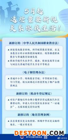 “五一”如约而至,一批重要新规也从本月起正式施行。新修订的职业教育法明确职校生在升学就业等方面与普校生享有平等机会;《电子烟管理办法》禁止向未成年人销售电子烟,禁止销售除烟草口味外的调味电子烟;新修订的《机动车登记规定》推行小客车登记全国“一证通办”;新修订的《地名管理条例》规定重要历史文化价值的地名一般不得更名……看图了解详情!(记者白阳,海报设计杨轶群)