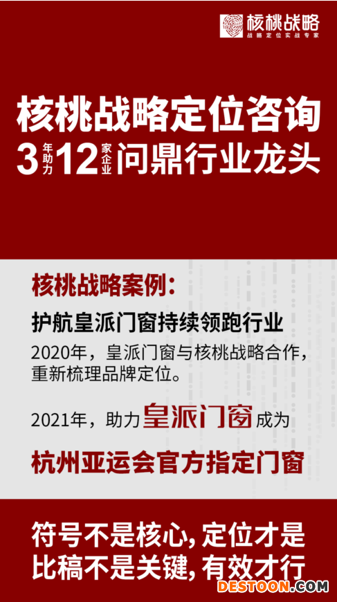 皇派门窗于2007 年创立至今,以卓越的制造工艺、智能科技实现了跨越式发展,无论技术、产品还是销量都达到了行业领先水平。随着越来越多的品牌加入竞争,具有战略思维的企业识别到,竞争的制高地已从产品、价格升级为品牌,门窗行业的经营重心,也从产品、渠道转向顾客心智中,实现多维度的竞争。因此,皇派门窗亟需品牌化提升与转型,在多方寻求战略合作后,2021 年,最终携手和核桃战略,在竞争方向、品牌定位、运营落地等方面,达成三年深度战略合作。