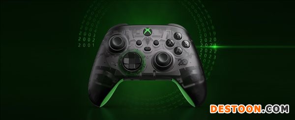控制器黑色中点缀了些许绿色的半透明外壳以及顶部黑绿相间的Xbox按钮,借鉴了经典初代Xbox外形设计。控制器内部银灰色的20标志喻示着Xbox 20年来的发展同时也在展望未来。