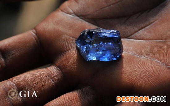 该宝石重达1404.49克拉,它打破了之前1395克拉宝石的世界纪录,成为目前世界上最大的蓝宝石。图为2012年产自斯里兰卡的蓝宝石,质地清透。